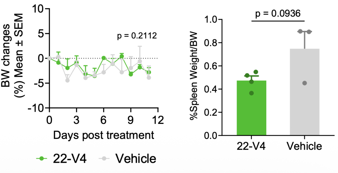 体内,纳米抗体修饰的LNP不影响小鼠体重、脾脏重量分数