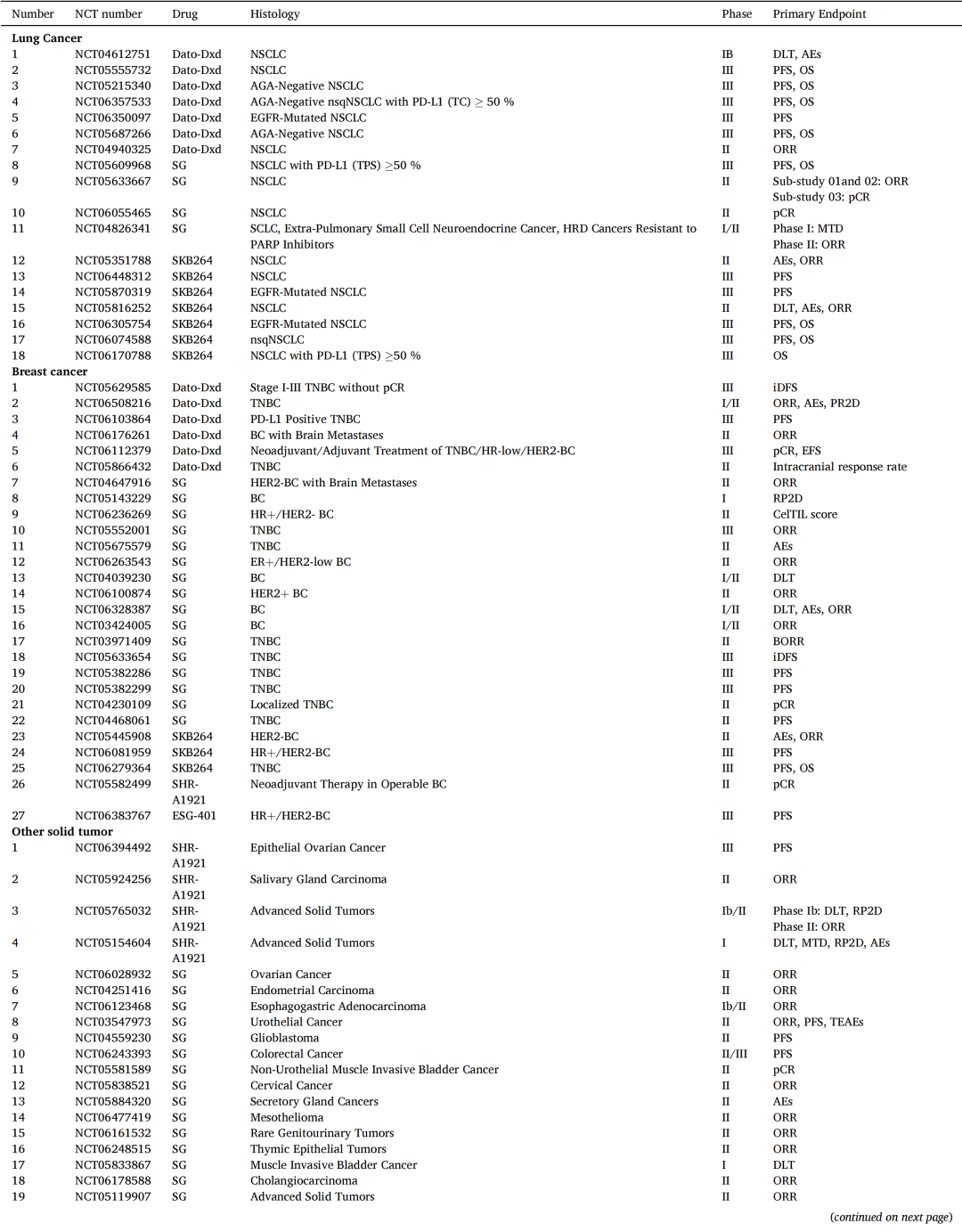 ①NSCLC:SG用于经治晚期NSCLC的mPFS5.2个月、mOS9.5个月;Dato-DXd6mg/kg剂量组mPFS6.9个月,对EGFR突变患者疗效更优。