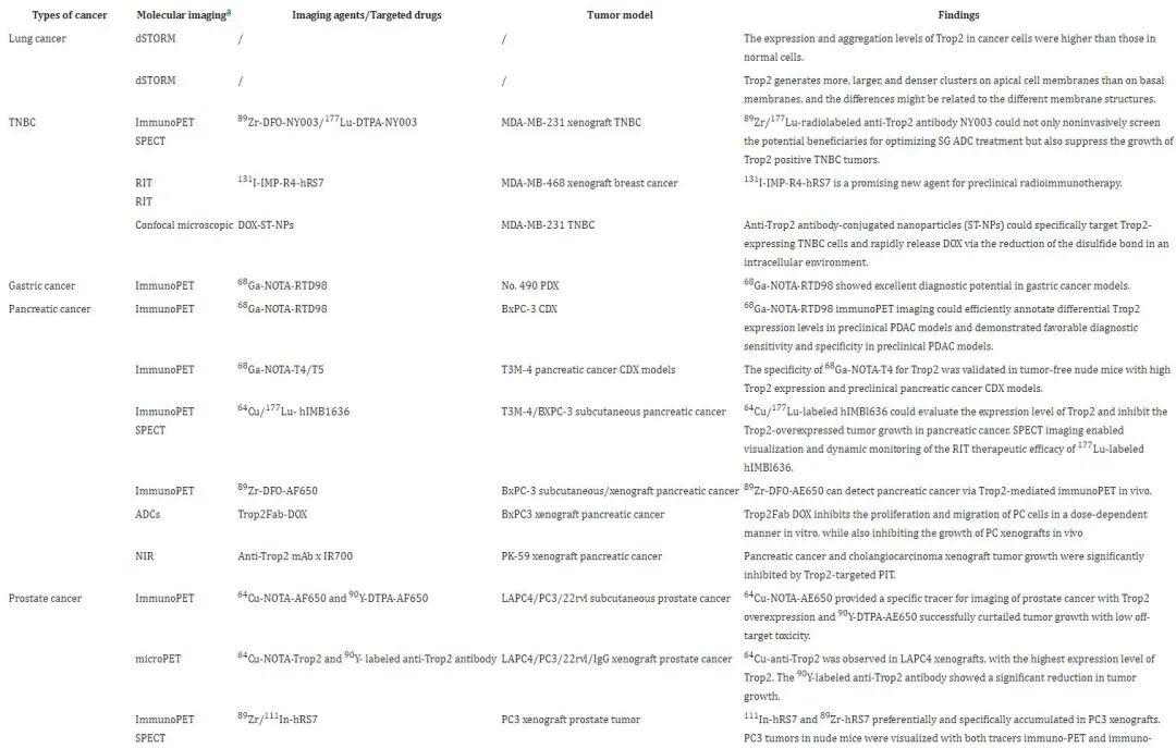 表4 针对Trop2的不同分子成像技术在肿瘤学上的应用