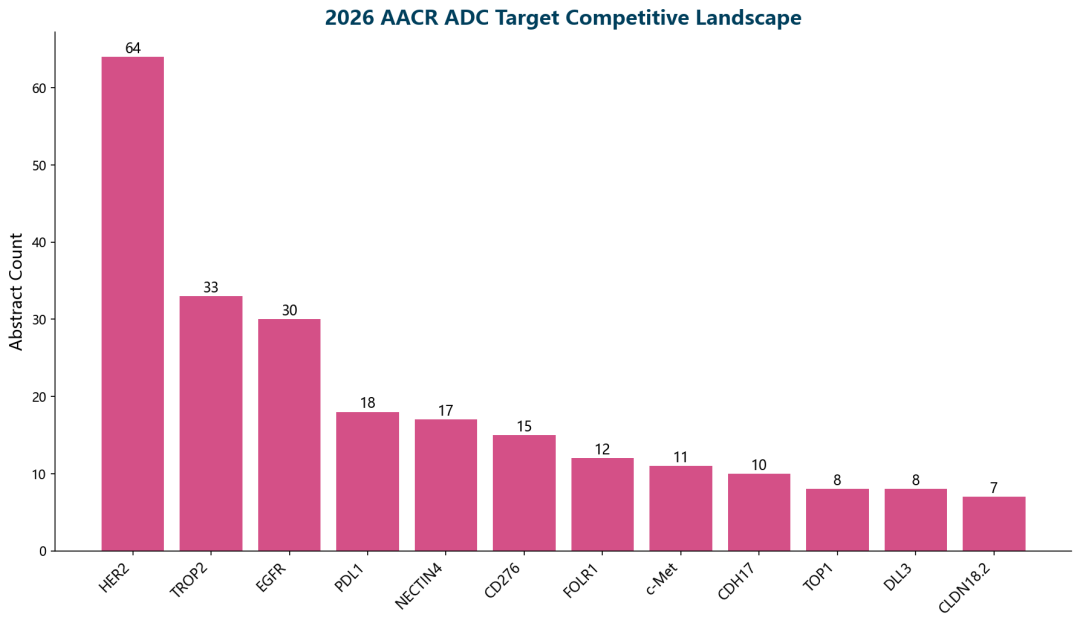 - HER2 在ADC方向最为密集(64篇),T-DXd仍是标杆,但HER2双抗ADC正在崛起