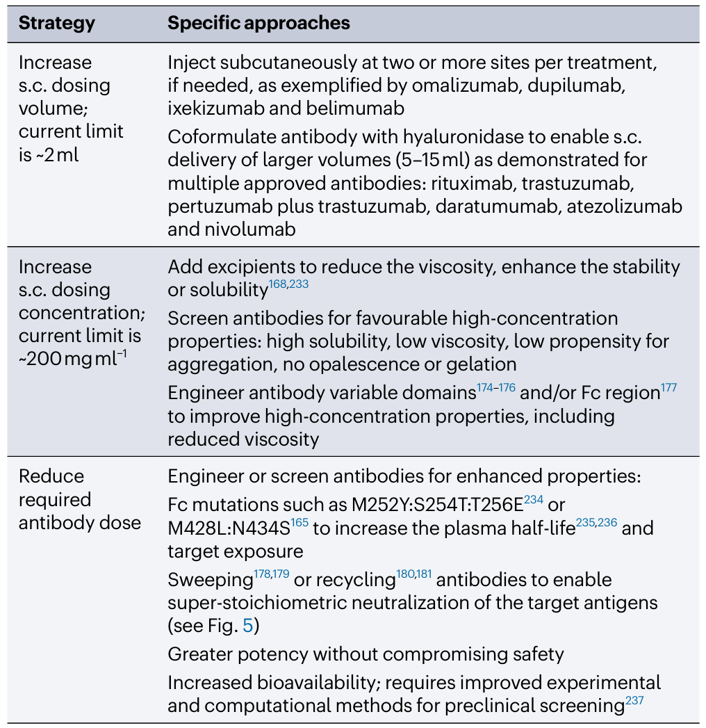 表 1 | 提高抗体用于皮下给药的潜力