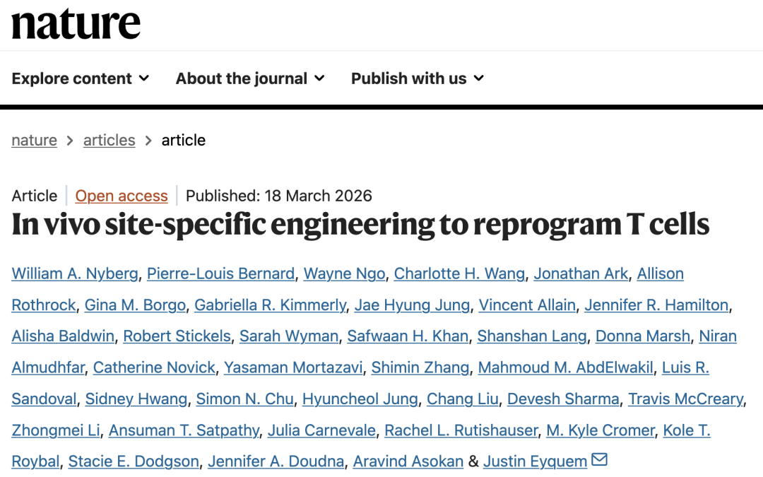 2026 年 3 月 18 日,加州大学旧金山分校研究人员在国际顶尖学术期刊 Nature 上发表了题为:In vivo site-specific engineering to reprogram T cells 的研究论文。