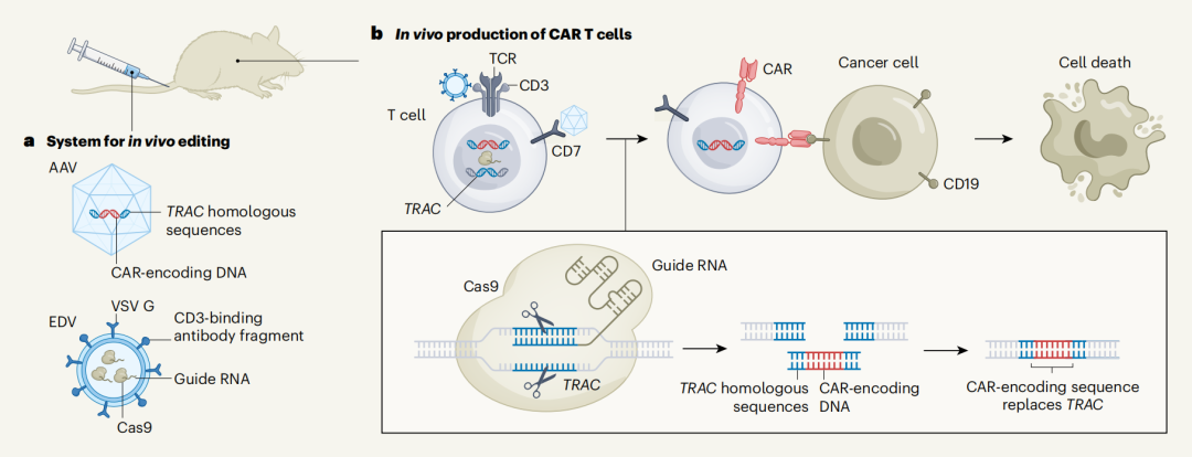 该研究开发了一种双载体系统——使用包膜递送载体(EDV)和腺相关病毒(AAV)分别递送 CRISPR–Cas9 RNP 和 CAR 模板,将 CAR 高效且特异性整合到 T 细胞的 TRAC 位点,在人源化小鼠模型的 B 细胞发育不全、血液系统恶性肿瘤和实体瘤中体内生成了治疗水平的 CAR-T 细胞。这些发现为更高效、更精准且更广泛可及的 T 细胞疗法开辟了新途径。