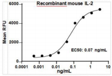 Recombinant mouse IL-2 stimulates cell proliferation of the CTLL-2 mouse cytotoxic T cells.